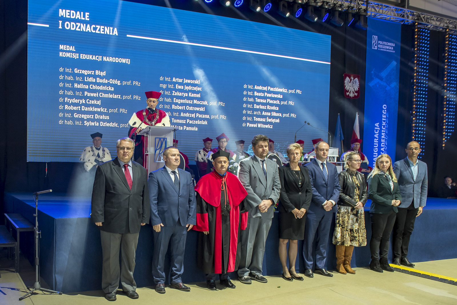 Podczas uroczystości pięciu pracowników naszej uczelni zostało odznaczonych Medalem Złotym za Długoletnią Służbę, sześć osób – Medalem Srebrnym za Długoletnią Służbę i siedem osób Medalem Brązowym za Długoletnią Służbę. 23 pracowników naszej uczelni zostało odznaczonych Medalem Komisji Edukacji Narodowej, pięć osób otrzymało medal „Zasłużonym dla Politechniki Rzeszowskiej”, a jedna odznakę honorową „Zasłużony dla Kultury Polskiej” za wyróżniającą się postawę w tworzeniu, upowszechnianiu i ochronie kultury. Tę część poprowadził prorektor ds. studenckich prof. dr hab. Grzegorz Ostasz. „Droga Młodzieży Akademicka, Szanowni Zebrani zgodnie z tradycją ogłaszam rok akademicki 2020/2021 na Politechnice Rzeszowskiej za rozpoczęty” – powiedział JM Rektor, uderzając trzy razy berłem, a Chór Akademicki odśpiewał Gaude Mater Polonia. Wykład inauguracyjny Mosty – awangarda współczesnej inżynierii lądowej wygłosił prof. dr hab. inż. Tomasz Siwowski.
