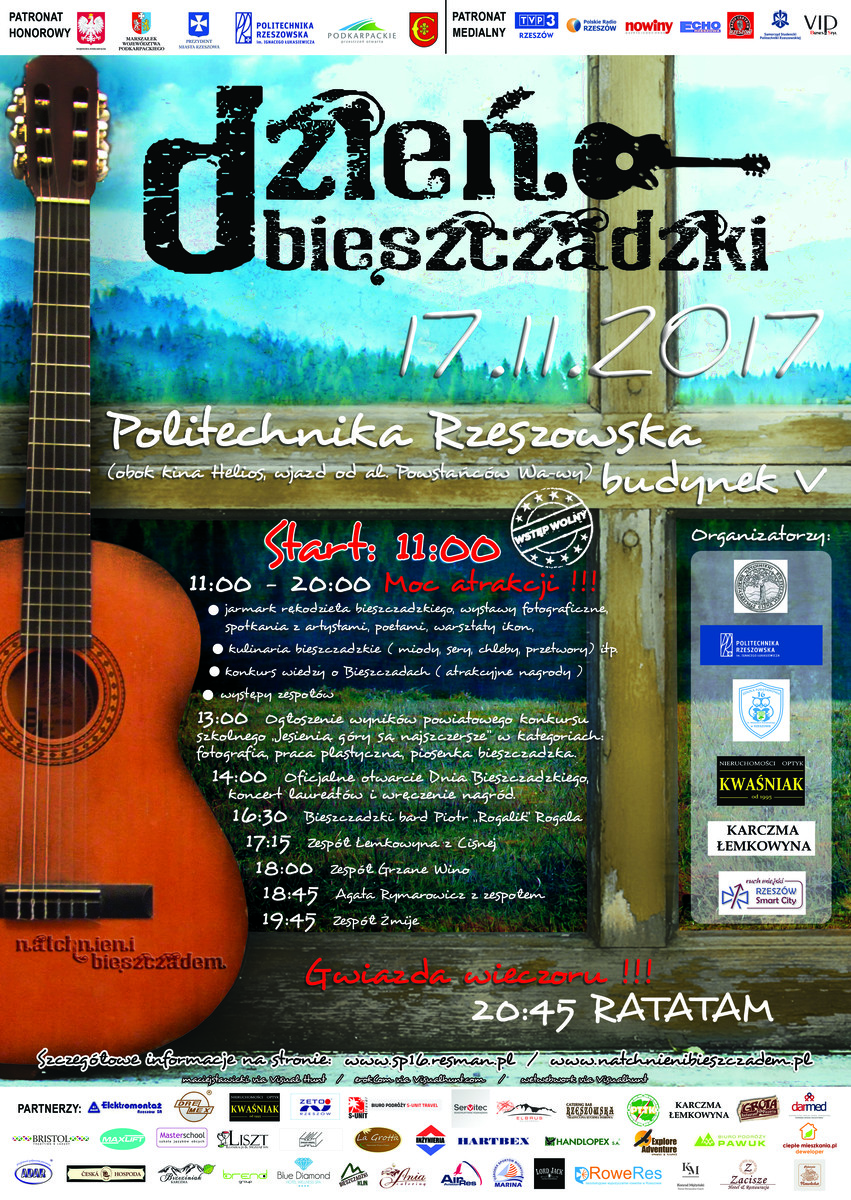 Dzień Bieszczadzki na Politechnice Rzeszowskiej wypełniony będzie prezentacją produktów regionalnych, poezją, fotografią, rzeźbą, pokazem rękodzieła i malarstwa. Podczas imprezy wystąpią: Agata Rymarowicz z zespołem, grupa Łemkowyna, zespół Żmije, Piotr Rogala „Rogalik” i zespół Grzane Wino. Gwiazdą wieczoru będzie grupa Ratatam.
