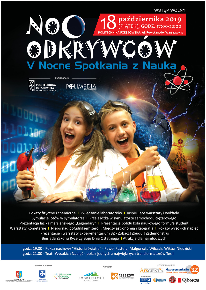 Politechnika Rzeszowska i firma Polimedia organizują „NOC ODKRYWCÓW - V Nocne Spotkania z Nauką”. Wydarzenie adresowane jest do wszystkich: dzieci i ich rodziców, młodzieży szkolnej, studentów, mieszkańców Rzeszowa i Podkarpacia – miłośników wiedzy oraz ludzi „ciekawych świata” i zachodzących w nim zjawisk. Impreza odbędzie się 18 października od godz. 17:00 do godz. 22:00.